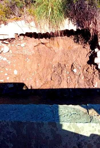 Este daño, es lo más grave, porque deja al canal expuesto frente a otras crecidas o lluvias que desmoronen el suelo y con la posible caída del canal