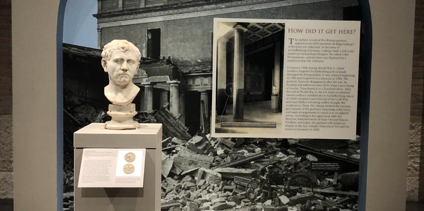 The iconic Roman bust on view at the San Antonio Museum of Art (SAMA) holds a compelling and mysterious story. In the fall of 2018, the bust — a sculpture representation of the upper section of the body — mysteri ously ended up at a local Goodwill in Austin, Texas, and was then purchased for $34.99 by Laura Young after it had not been recognized since the end of World War II. A consultant in Europe, who happened to have a photographic memory, remembered seeing the same bust in an old archive and decided to dig deeper into the sculpture’s origin.