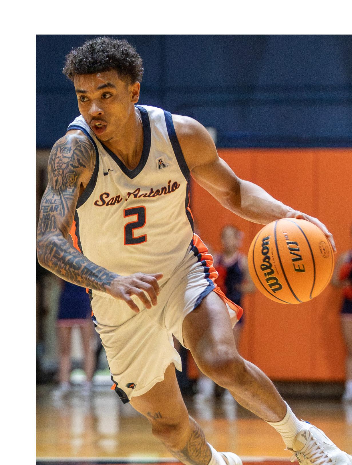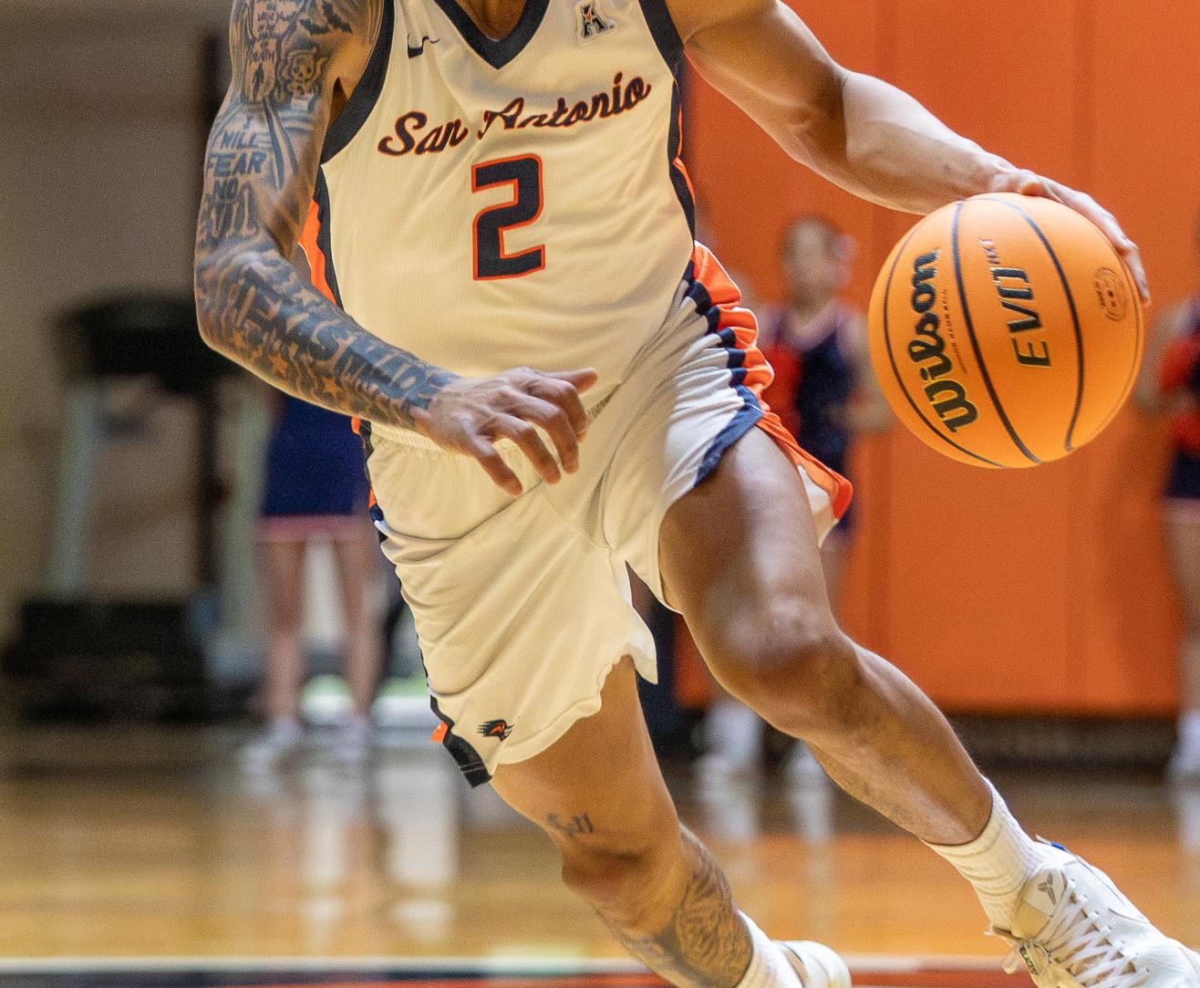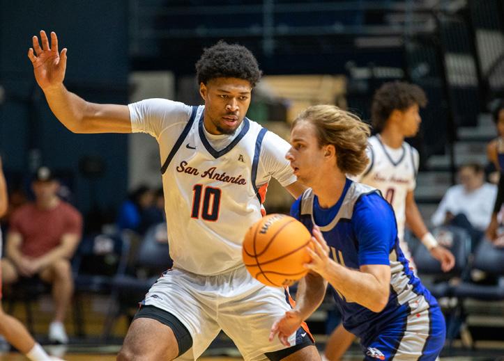 The ‘Runners scored 20 points in the frst seven minutes and quickly created a double-digit lead to start the contest. After establishing the lead, the Roadrunners never allowed the game to come within 10 points. UTSA’s ball movement looked effortless on the offensive end. The ‘Runners scored at will, whether from isolation sets or moving the ball around the perimeter to fnd the open man. Simpson feasted on the Eagles’ zone defense, scoring a team-leading 14 points in the frst half. The Roadrunners consistently