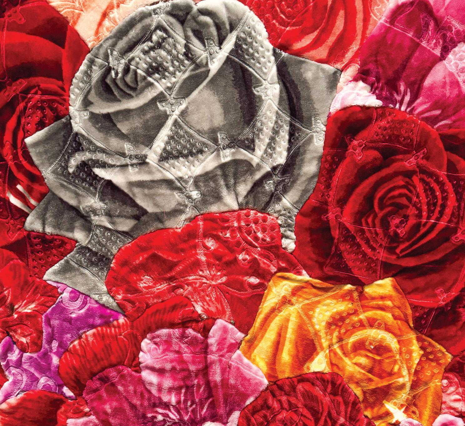 that presents a tapestry-esque look. The blend of aluminum wrappers from brands — such as Dos Equis, Dove Chocolate and Cashew Roca — creates a shiny effect mimicking a luxurious gold texture while yielding a similar pattern to a zarape, a traditional Mexican cloak-like clothing article. This collage represents the elegance found in items that can be found in lower-class communities.