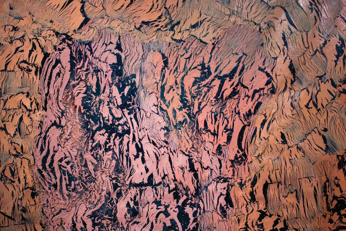 Alvarado utilizes zig-zag patterns, neon colors and heavy brushstrokes to breathe life into the textiles. Her pieces infuse the cultural history of textile making with fine art techniques; the artworks are seemingly moving. Human silhouettes form within the weighty brushstrokes as one examines “Traditional Object 13.” The negative space begins to take over the lumps of pink paint. “Traditional Object 13” is not stagnant. It is in conversation with the viewer.