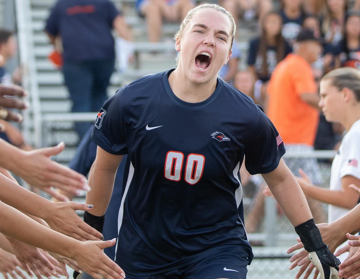 UTSA junior goalkeeper Jasmine Kessler shouts as she runs onto the field pregame versus Lamar University
