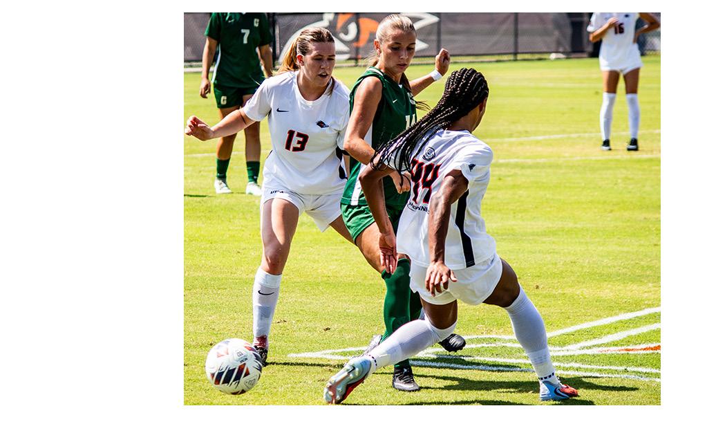 Zoë May and Izzy Lane battle for possession of the ball with a Charlotte defender in UTSA soccer’s matchup this past Sunday at Park West Athletics Complex.