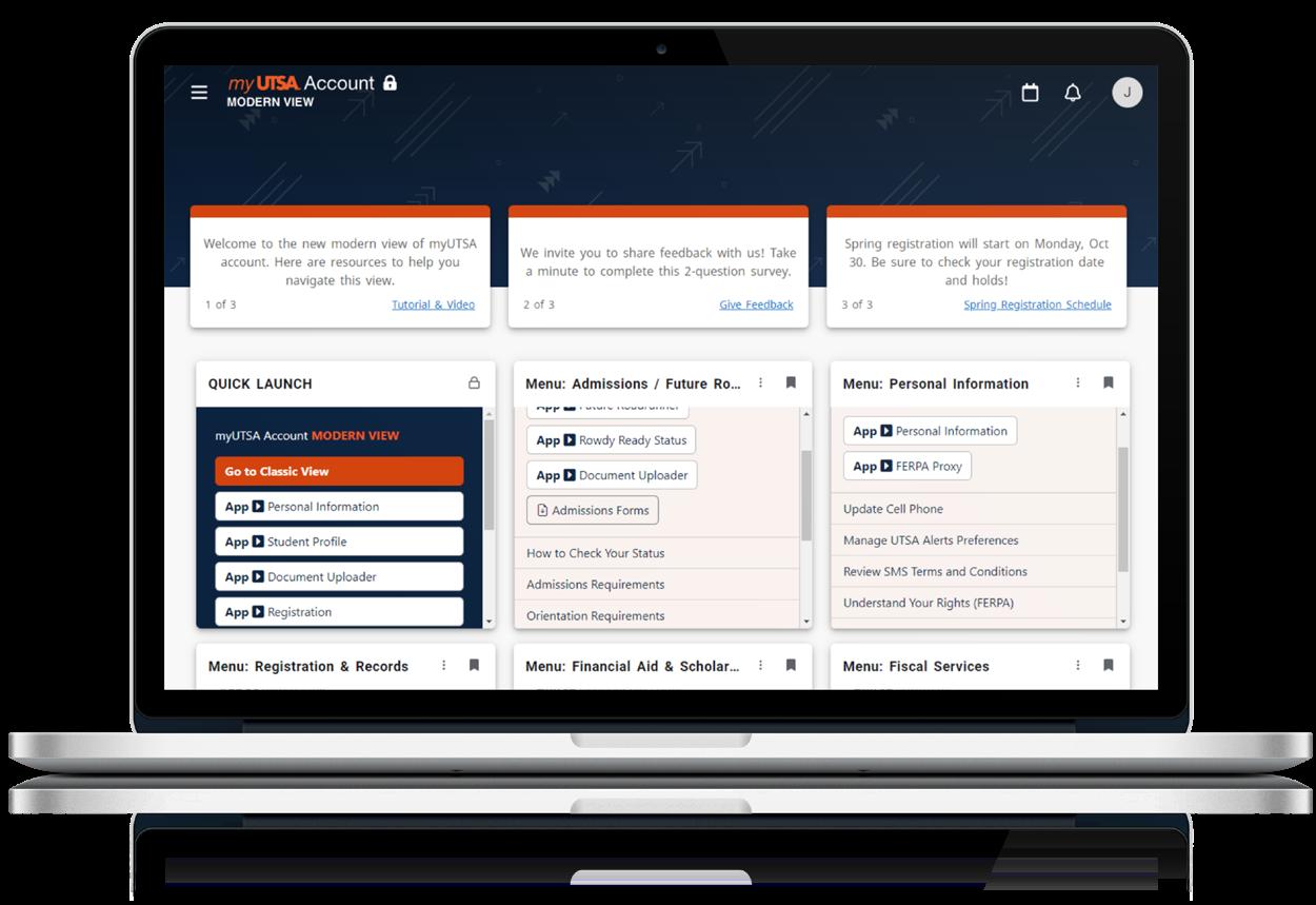 platform at my.utsa.edu/, selecting the orange “Modern View” button and entering their myUTSA ID and passphrase.