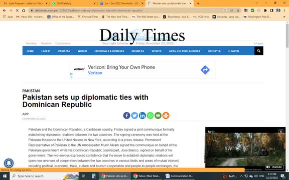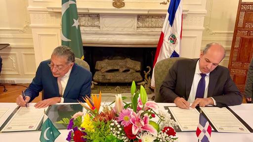 Ambassador Munir Akram of The Permanent Mission of Pakistan and Ambassador Jose Blanco of the Permanent Mission of The Dominican Republic, signed a joint communique formally establishing diplomatic relations between the two countries. The signing ceremony was held at the Pakistan Mission to the United Nations in New York on 18 November 2022.