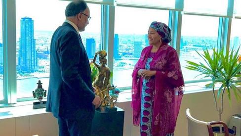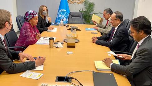 Ambassador Munir Akram Permanent Representative of Pakistan to the UN as G77 Chair meeting with Deputy Secretary General DSG Amina Mohamed AUGUST 2022