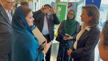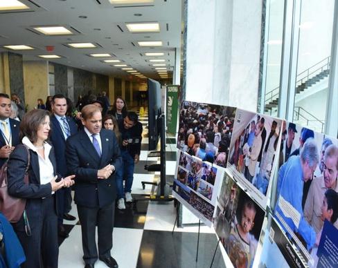 Prime Minister Shehbaz Sharif, Melissa Fleming, and Minister of Information Marriyum Aurangzeb visit the photo exhibition on Floods in Pakistan in the United Nations.