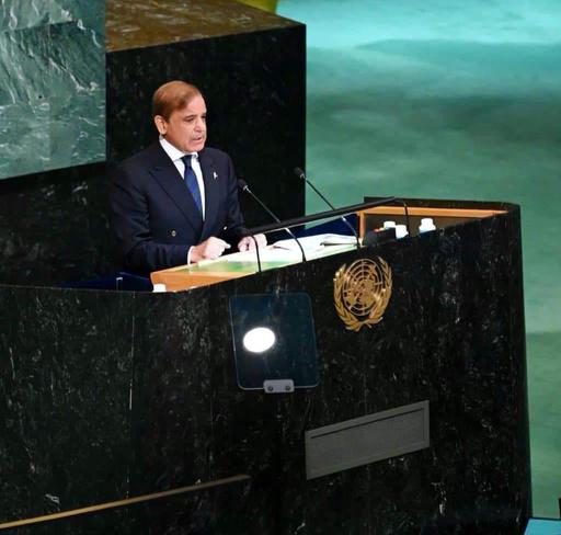 Prime Minister Shehbaz Sharif speaking at the 77th session of the United Nations.