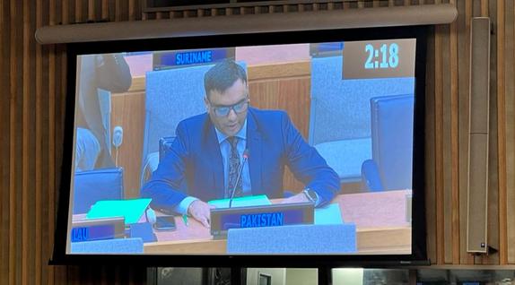 Counselor, Jibran Durrani speaking at the 1st meeting of the 5th Committee during the 77th session.