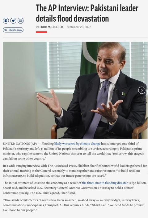 "In my country, Pakistan, floods have claimed 33 million lives and caused damage equivalent to 10% of GDP "