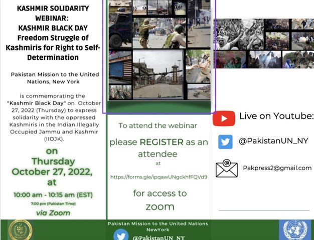The Permanent Mission of Pakistan to the United Nations held a webinar on October 27th, 2022 to commemorate Kashmir Black Day.