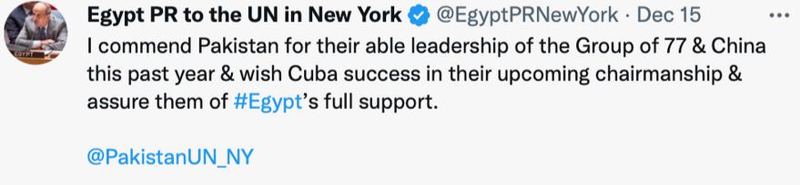 As the chair of the G77 + China group, Pakistan has advocated for the awarenes of issues that threaten the safety of the people in its member states. Climate Change, the 2030 agenda, Poverty, and Sustainable Development are amongst the multiple issues that Pakistan has aimed to resolve.