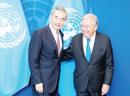 Meeting Guterres at the UN headquarters on the sidelines of the ongoing 79th UN General Assembly Wang also a member of the Political Bureau of the Communist Party of China Central Committee congratulated the UN on its success in convening the Summit of the Future He said the adoption of the