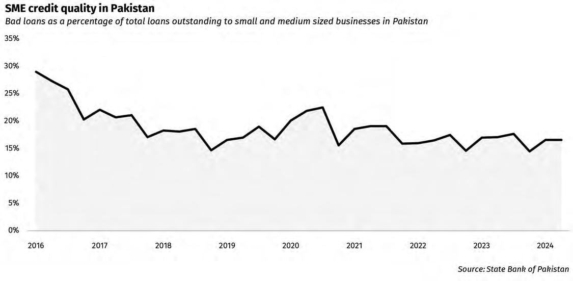 SME financing has been a major bottleneck in Pakistan for decades. Traditional banks have historically been apprehensive of lending to the private sector, preferring to invest in government-issued treasury bills. This inclination is fueled by multiple factors, primarily the high-risk profile of the private sector, particularly SMEs, further exacerbated by the high interest rates that have dominated since the beginning of fiscal year 2020.