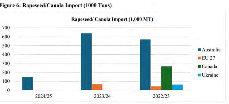 And some steps have, indeed, been taken by the government to help support local rapeseed production. In 2024, the government removed support pricing for wheat, encouraging farmers to look for alternative crops to plant. Rapeseed is generally considered a low input, and less risky crop, and the production, according to a US Department of Agriculture report, is projected to reach 565,000 tons, a 10 percent increase over output in 2024/25. This shift from wheat is the main motivator behind this change.