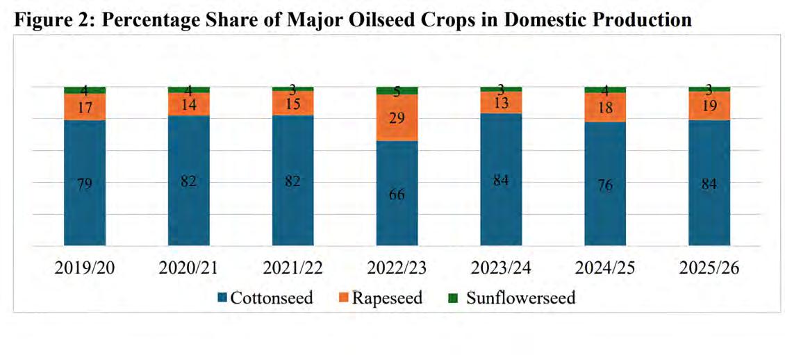 Pakistan’s domestic production is dominated by cottonseed, which accounted for about 76% of the total produce in 2024/25. Most of it is ground into cake to serve as feed for dairy cattle. Rapeseed was a distant second coming in at 19%, and sunflower seed was distant yet at 3%. Both the latter are used primarily for their oil, unlike cottonseed which is produced for its fibre. If we exclude cotton, the total area under oilseed cultivation is only around 3% of Pakistan’s 24.1 million hectares of total crop area.