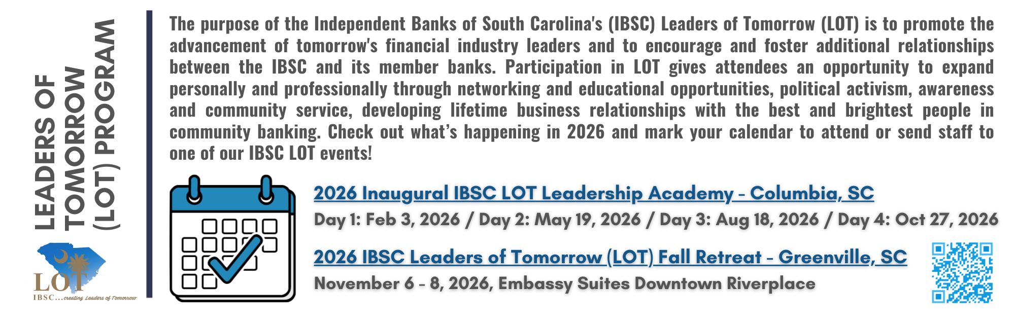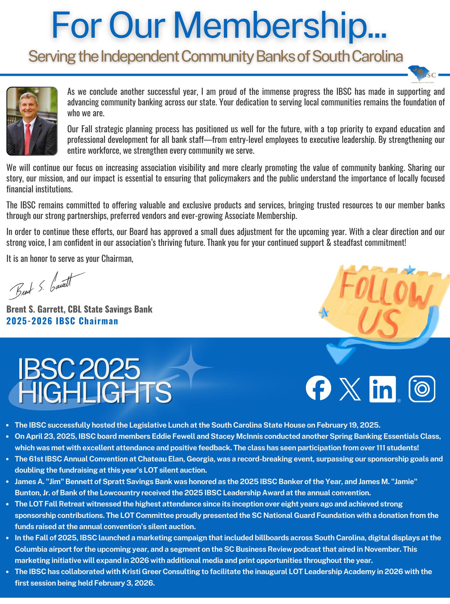 IBSC IS THE ONLY STATE ASSOCIATION TO EXCLUSIVELY ADVOCATE AND REPRESENT INDEPENDENT COMMUNITY BANKS IN SOUTH CAROLINA. WE ARE PRIVILEGED TO HAVE A DEDICATED AND ACTIVE MEMBER COMMUNITY; ALL PASSIONATELY COMMITTED TO SEEING COMMUNITY BANKS THRIVE.
