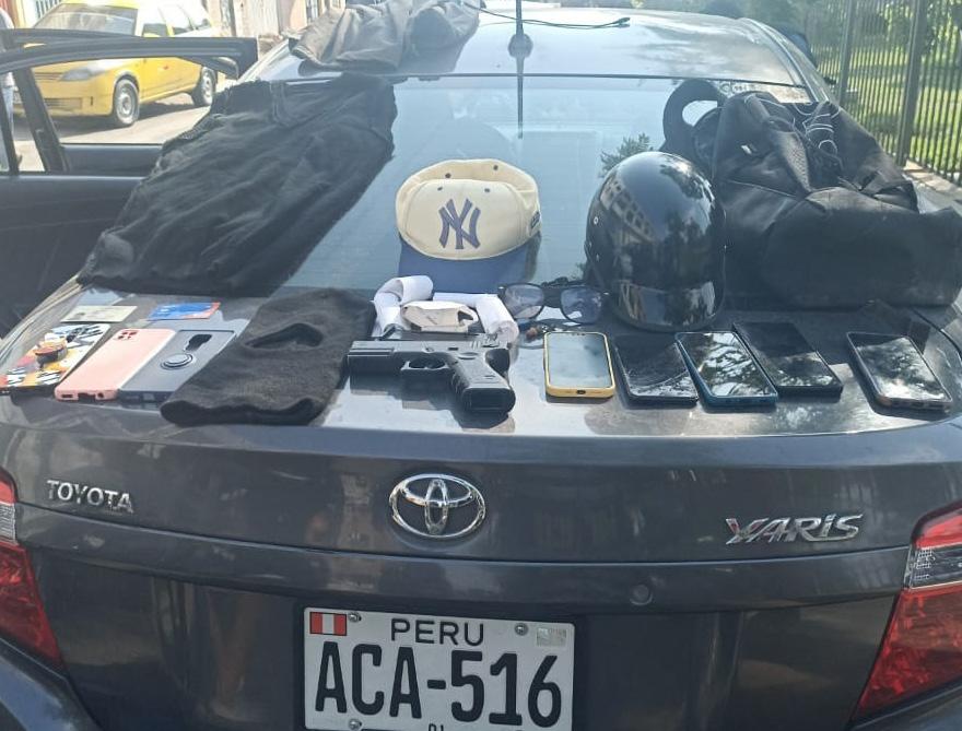 En el operativo, se le incautó cinco equipos móviles, dos auriculares, una moto lineal con placa de rodaje 8788-KA y un automóvil marca Toyota con placa de rodaje ACA-516..