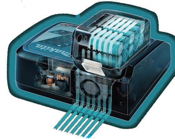 El cargador rápido de Makita se comunica con el chip incorporado de la batería durante todo el proceso de carga para optimizar la vida útil de la batería. Controlando la corriente, el voltaje y la temperatura.