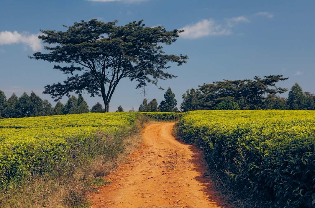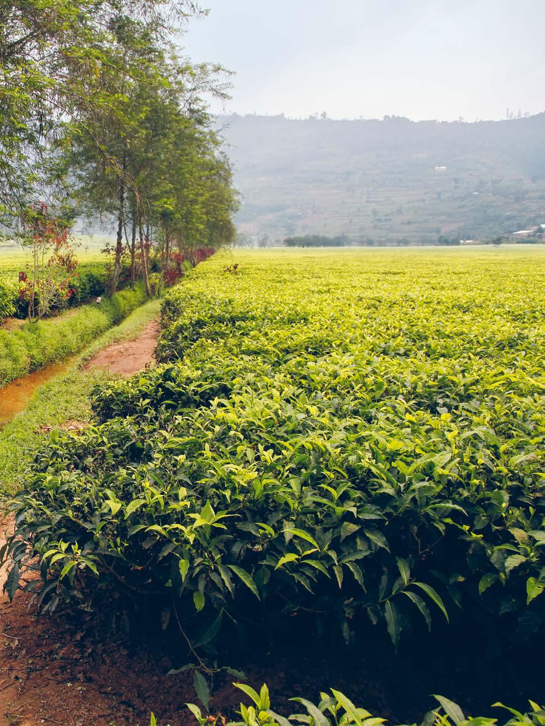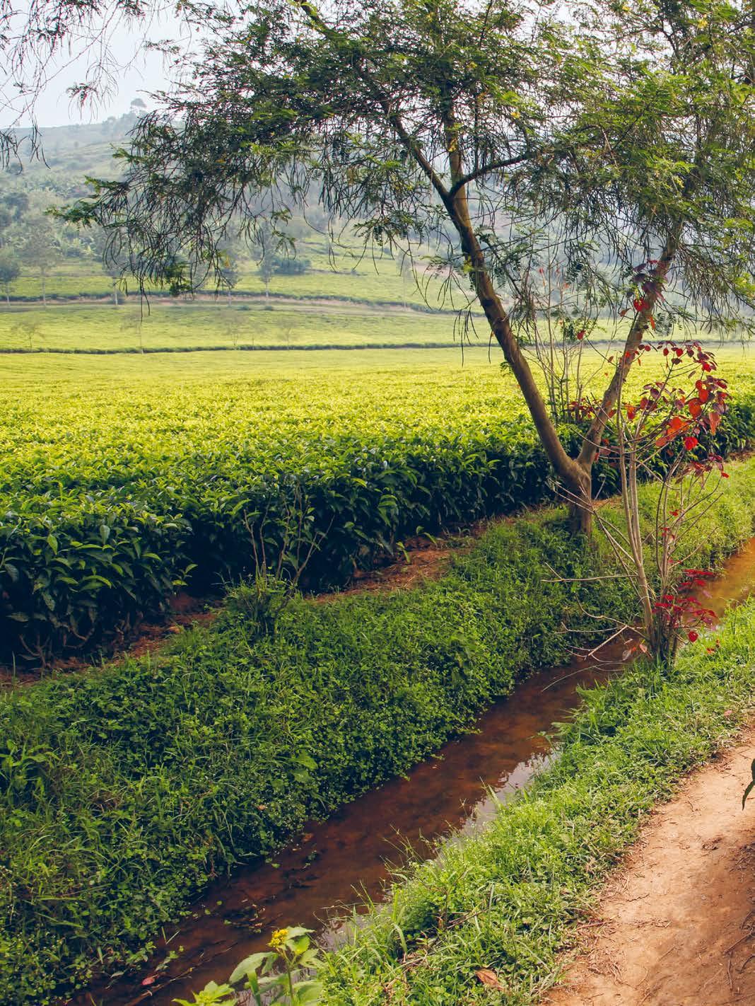 Trees planted among the tea plants provide shade and help the soil retain moisture.