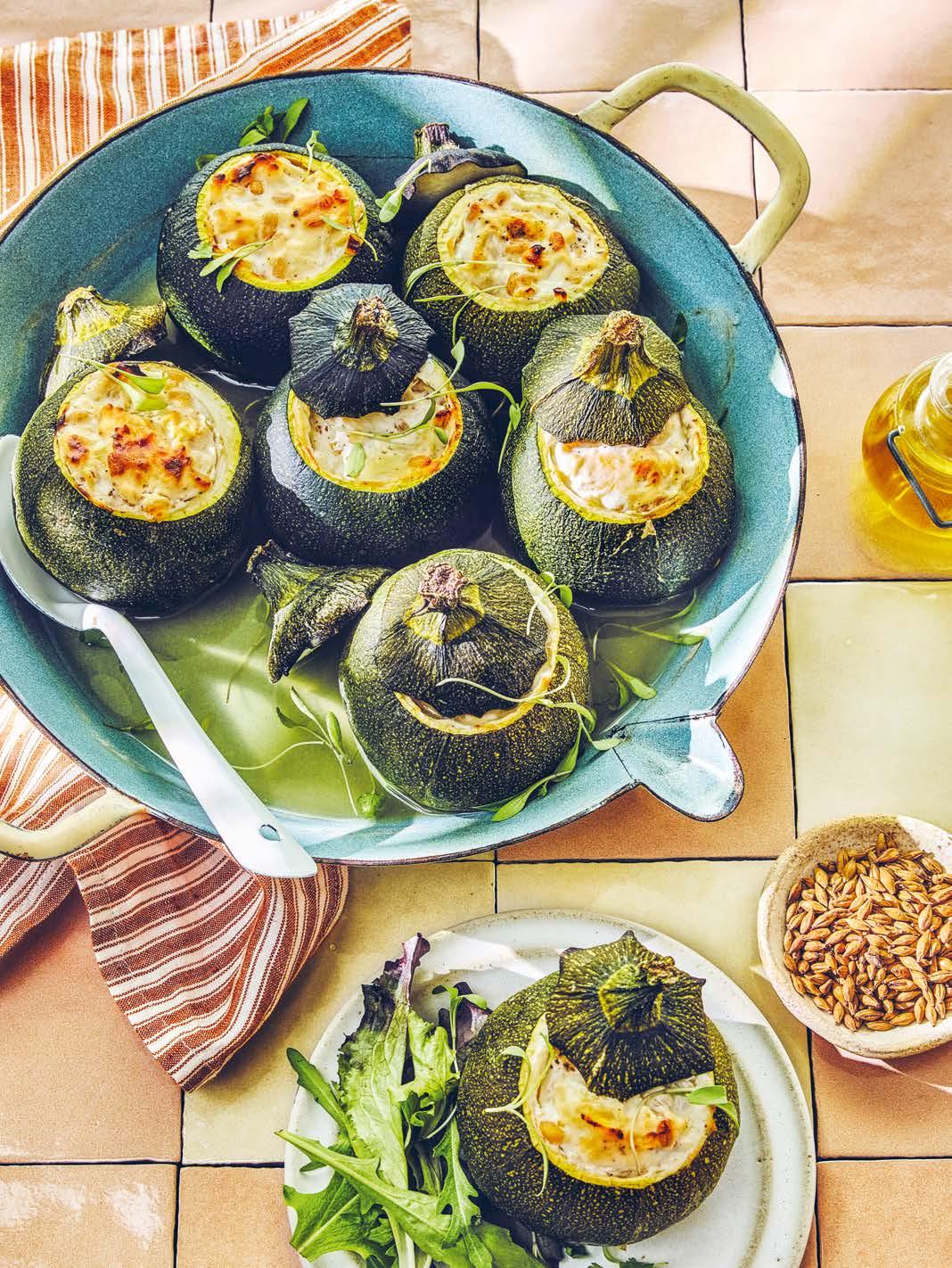 Enhanced with the toasted nutty notes of Mugicha, these stuffed zucchini can be served with a fresh green salad – also dressed with a Mugichainfused vinaigrette – making for a healthy and flavor-packed recipe!