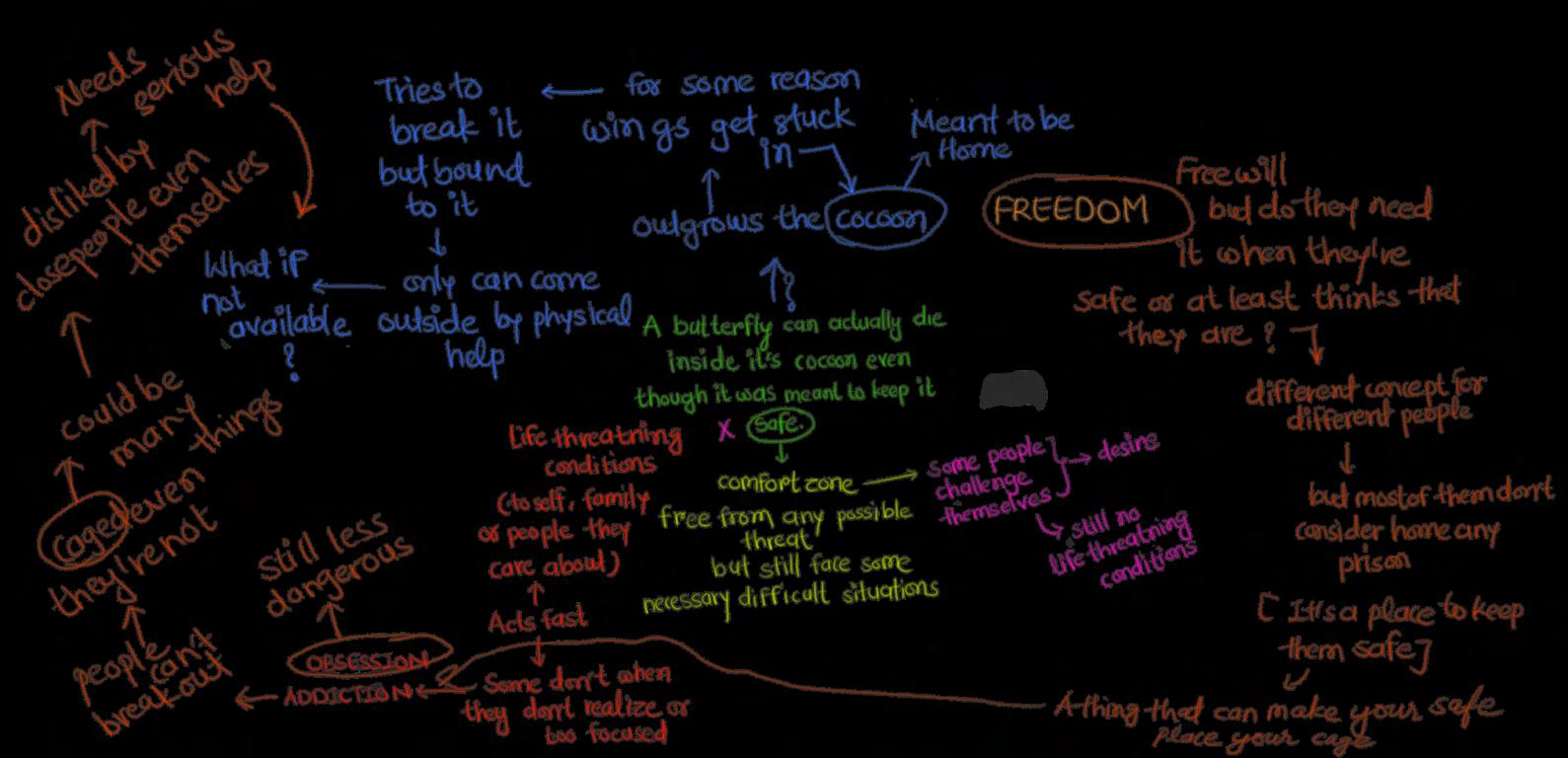 Here I have used the metaphor ‘Cocooned cage’ for the idea of comfort turning into helplessness portraying the example of cocooned stuck butterfly and addicts.