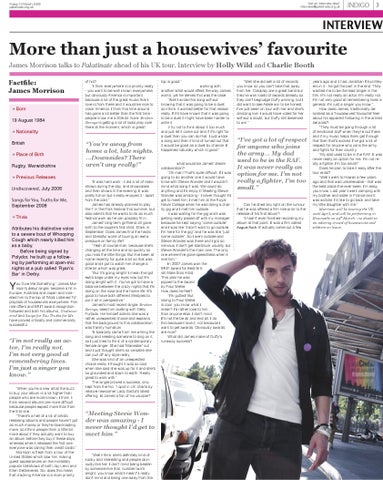More than just a housewives’ favourite James Morrison talks to Palatinate ahead of his UK tour. Interview by Holly Wild and Charlie Booth Factfile: James Morrison «Born 19 August 1984 «Nationality British «Place of Birth Rugby, Warwickshire «Previous Releases Undiscovered, July 2006 Songs for You, Truths for Me, September 2008 «Trivia Attributes his distinctive voice to a severe bout of Whooping Cough which nearly killed him as a baby. Before being signed by Polydor, he built up a following by performing at open-mic nights at a pub called ‘Ryan’s Bar’ in Derby.