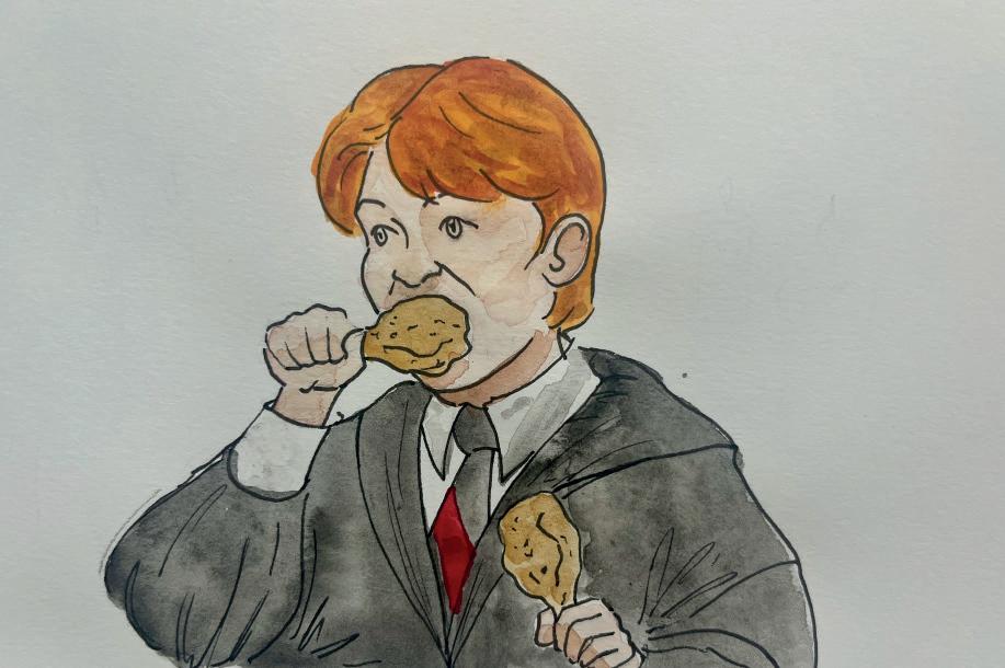 Harry Potter By Millie AdamsThe cinematic universe of Harry Potter goes down with a spoonful of sugar. The gentle of Hagrid’s giant is first seen in the bright green frosting of “Happee Birthdae Harry”. The friendship between Ron and Harry is kickstarted by a trolley-load of chocolate frogs and Every Flavour Beans. Dobby’s mischievous loyalty to Harry is played out in the ominous floating cake, smashed over the Dursley’s guests. We get to know the characters as they get to know each other, in the sociable world of fantastical food. The Great Hall hosts chicken