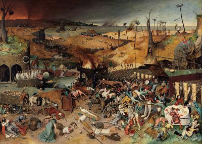 The scale and magnitude of horror in Pieter Bruegel the Elder’s ‘The Triumph of Death’ (1562) derives from the painting’s display of an tagonism between life and death, in the midst of a pandemic, where death is the ultimate conqueror over life. Where the vibrant block colours of the townspeople’s clothing con note vitality, and exuberance, the juxtaposition between this and the blurred, indistinct por trayal of the undead foregrounds that the fear of death indeed stemmed from its uncertainty and inescapability. The group of townspeople to the far left of the painting, portrayed hiding under the carriage of skulls led by a skeletal horse and horseman, are visually hiding from death. They shadow the movements of the car riage, hoping to go undeteced by the skeleton and its lantern, which can be assumed to be a metaphor for the idea of ‘seeing the light’. From this narrative alone, Bruegel underpins the desperate lengths people are willing to go