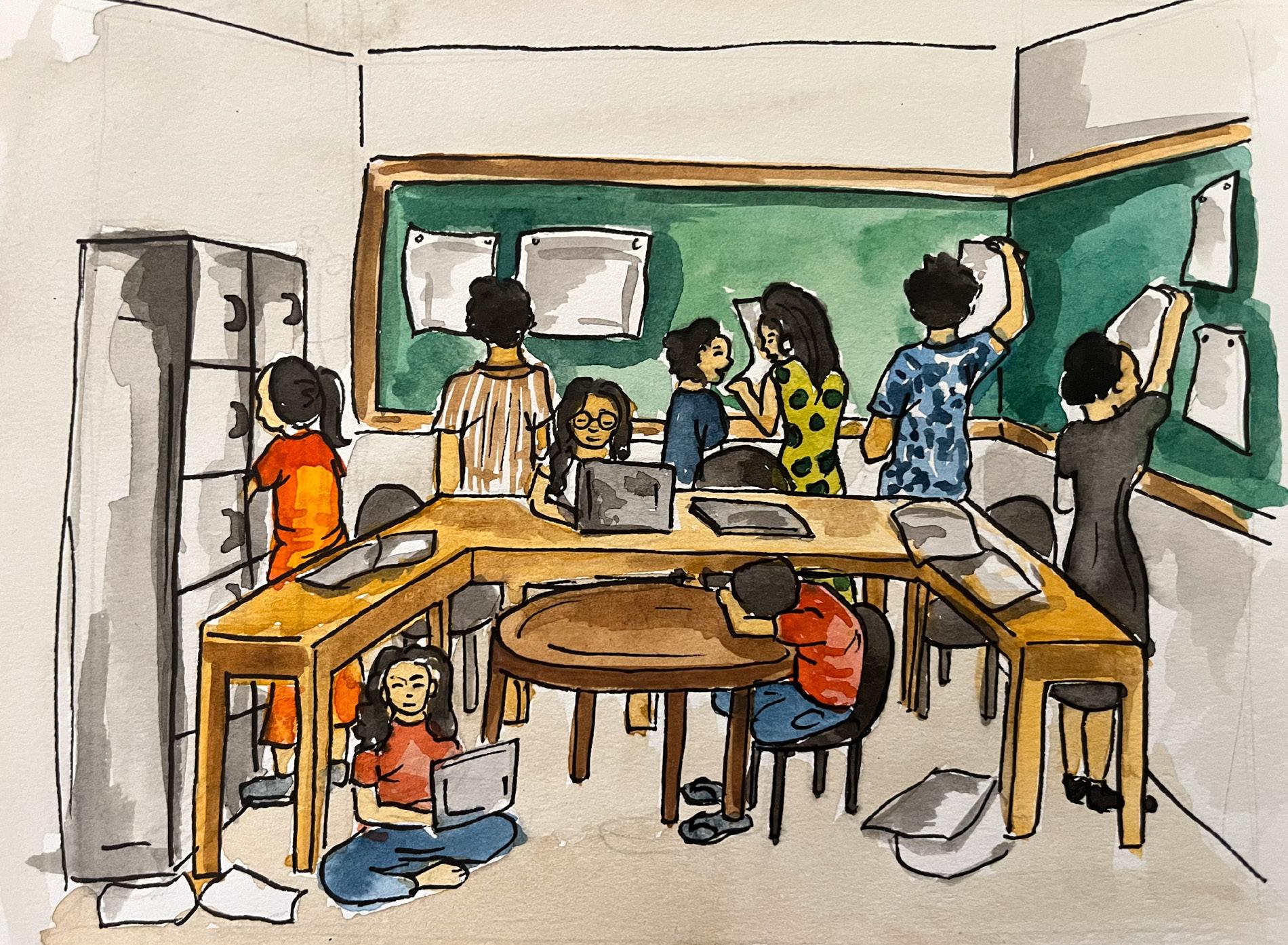 One of my favourite spaces in my college campus is the design studio. It’s a small classroom with a few tables and chairs. It has boards on all sides for us to display our work and a big projector on the wall. What I like about it is that it is always full of students working day and night! It feels like time stands still at the studio.