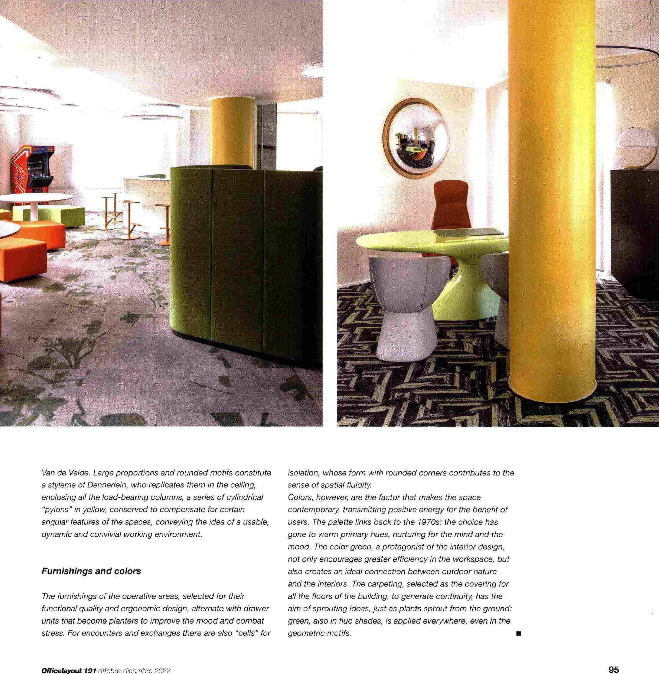 Van de Vefde. Large proportions and rounded motifs constitute a styleme of Dennerlein, who replicates them in the ceiling, enclosing all the load-bearing columns,a series of cylindrical "pylons"in yellow, conserved to compensate for certain angular features ofthe spaces, conveying the idea ofa usable, dynamic and convivial working environment.