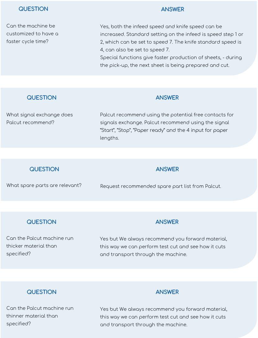 The standard Palcut dispenser has an average cycle time of at least 8,6 (Palcut 1200) and 9,7 (Palcut800) sec per sheet (1200x800mm format). A cycle is defined from pick up of sheet from the table until a new sheet is in place for pick up.