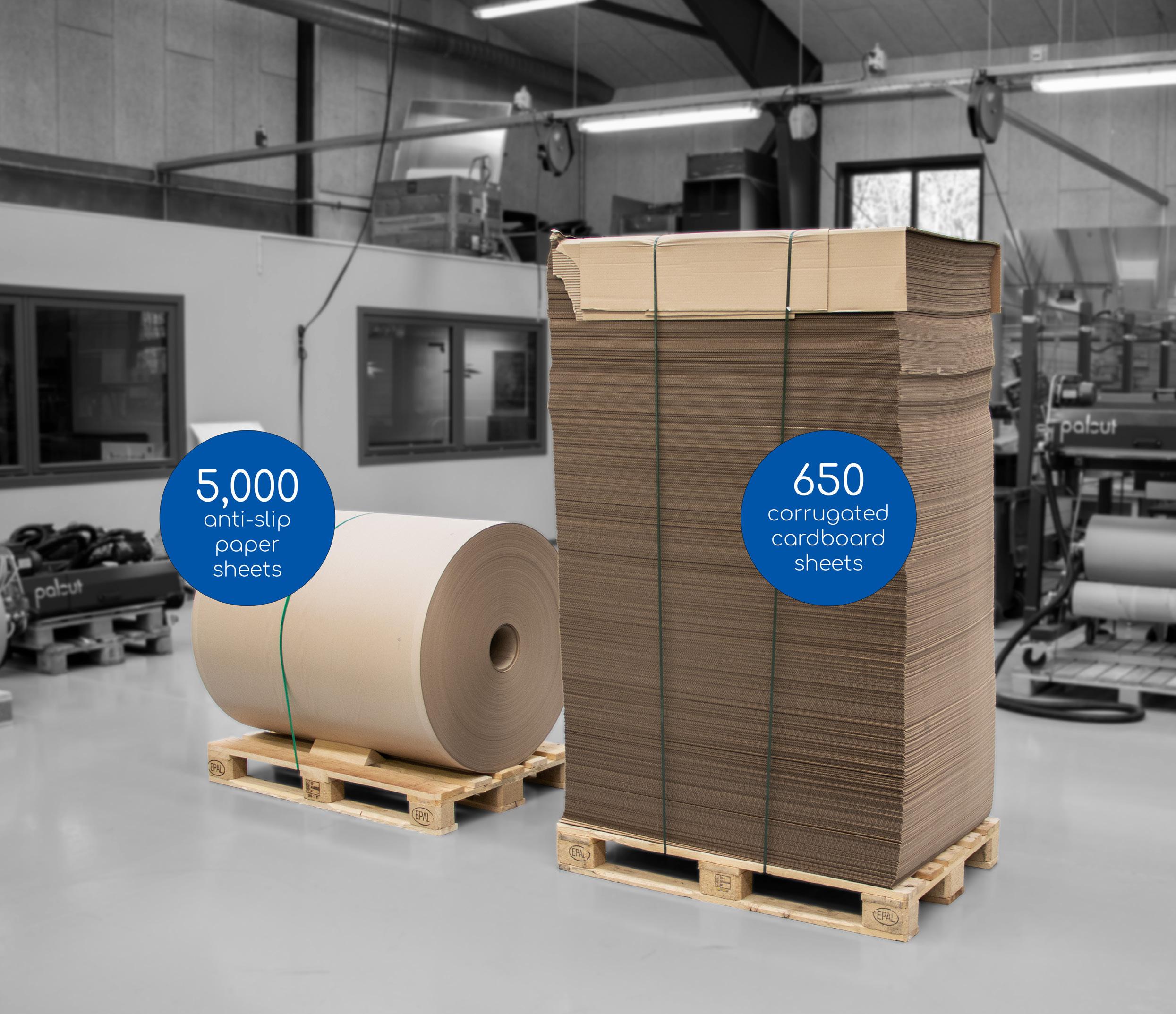 Our automatic sheet dispensers allow you to use reels of recycled anti-slip paper rather than pre-cut pallet sheets as in your traditional sheet magazine system. This means that you get up to 5,000 interlayer sheets from our reels in contrast to 650 corrugated cardboard sheets on a standard pallet.