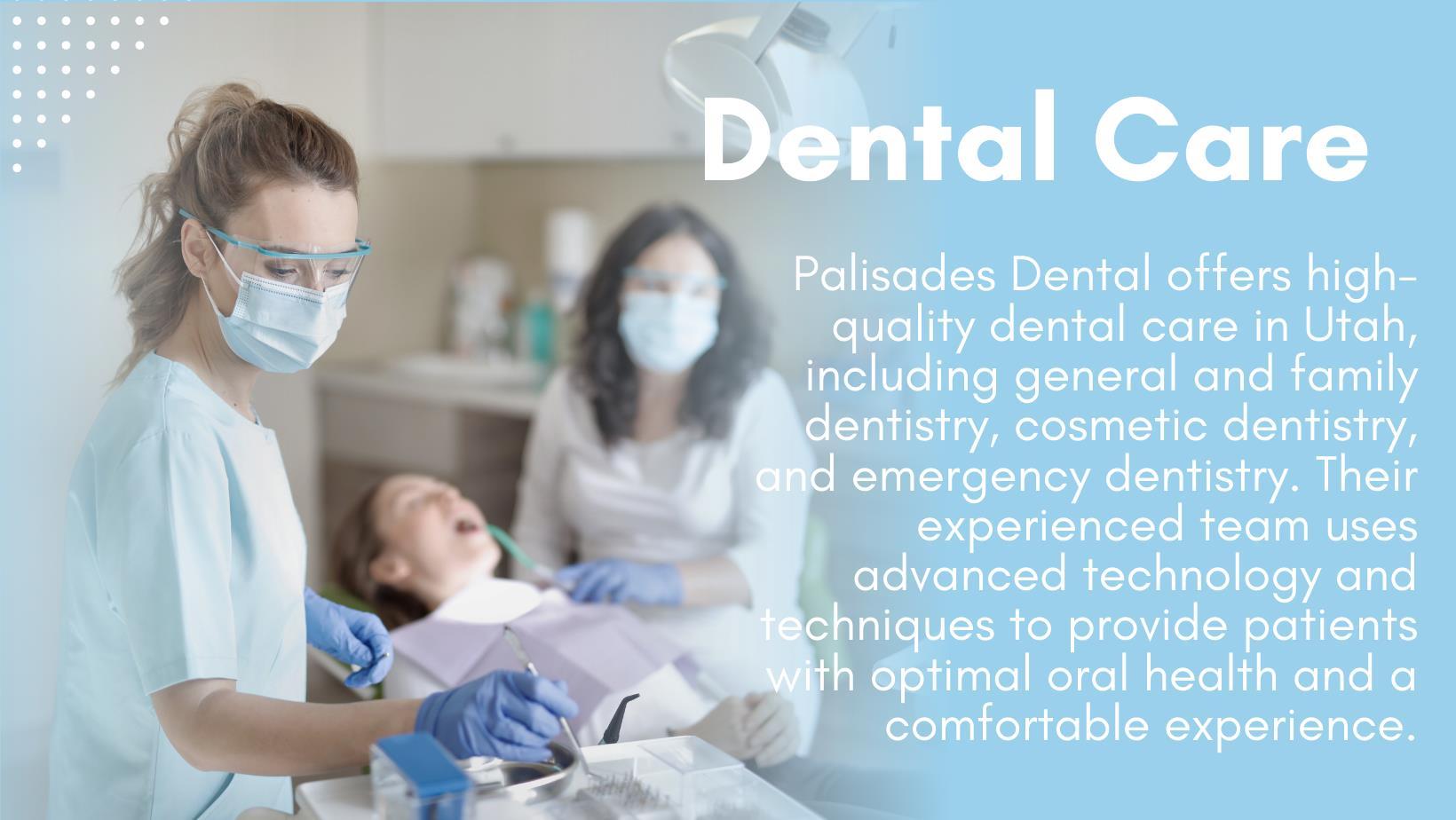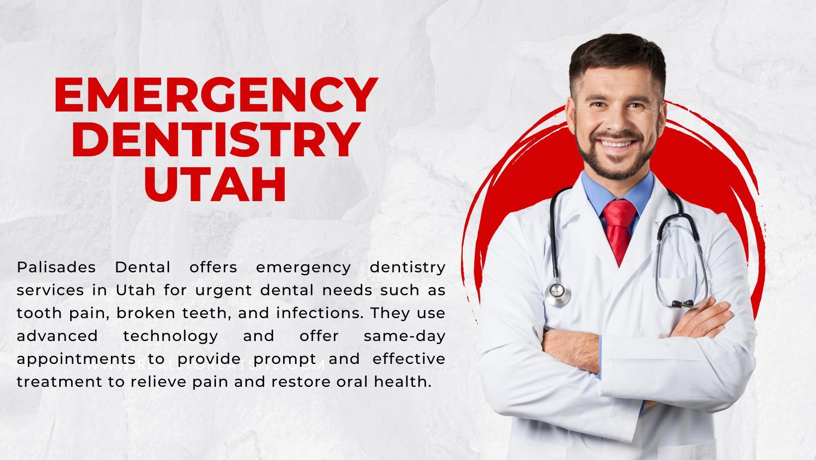 Emergency dental care services in Utah are provided by Palisades Dental. They offer prompt and effective treatment for a range of dental emergencies, including toothaches, broken teeth, and infections. Their team of experienced dentists and staff is dedicated to providing high-quality dental care to their patients, even in emergency situations. Palisades Dental uses advanced technology and techniques to provide their patients with the best possible care and offers same-day appointments to address urgent dental needs.