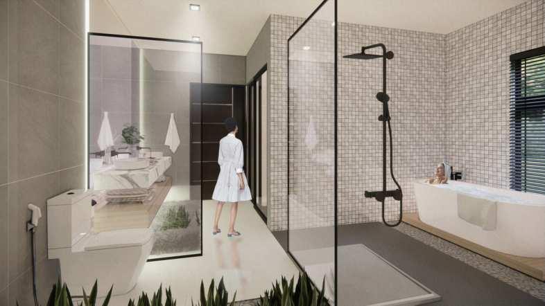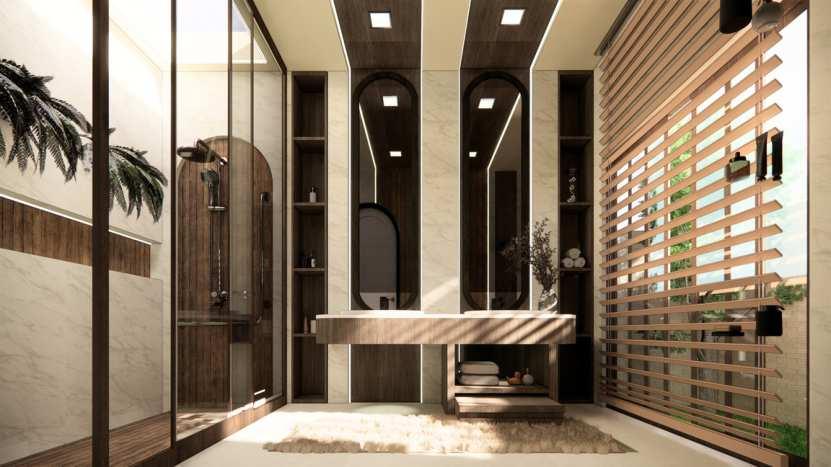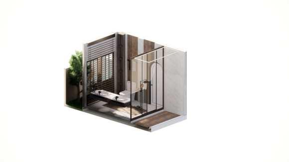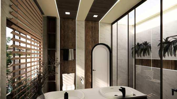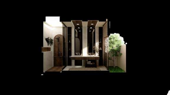 คอนN็์ของพื นที ส่วนนี คือการสร้าง ความสง่อนคลายOละพักสายา้วย รรยากาศจากสวน้านนอก มีีNทลนังลายไม้ที Nอมมาจาก งของ อ่างล้างมือOละNส้นไฟจากนัง วย NสริมริNวณที วางโถสุขภัณฑ์ให้โN่น พื นที โถสุขภัณฑ์