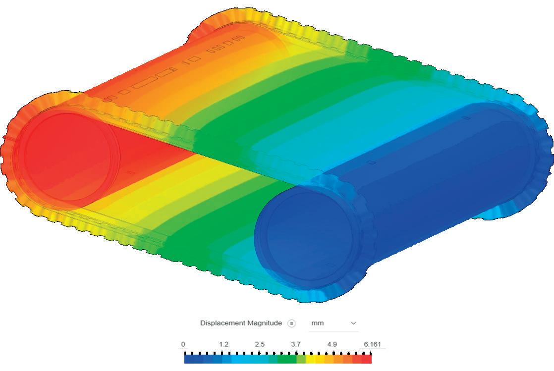 belt simulation FEA analysis, fixed and elastic supports on the belt with a load to simulate mining material in bulk, and to evaluate loads and traction. The image shows unwanted displacement in mm. Red areas indicate higher stresses and potential failure points, guiding design improvements.