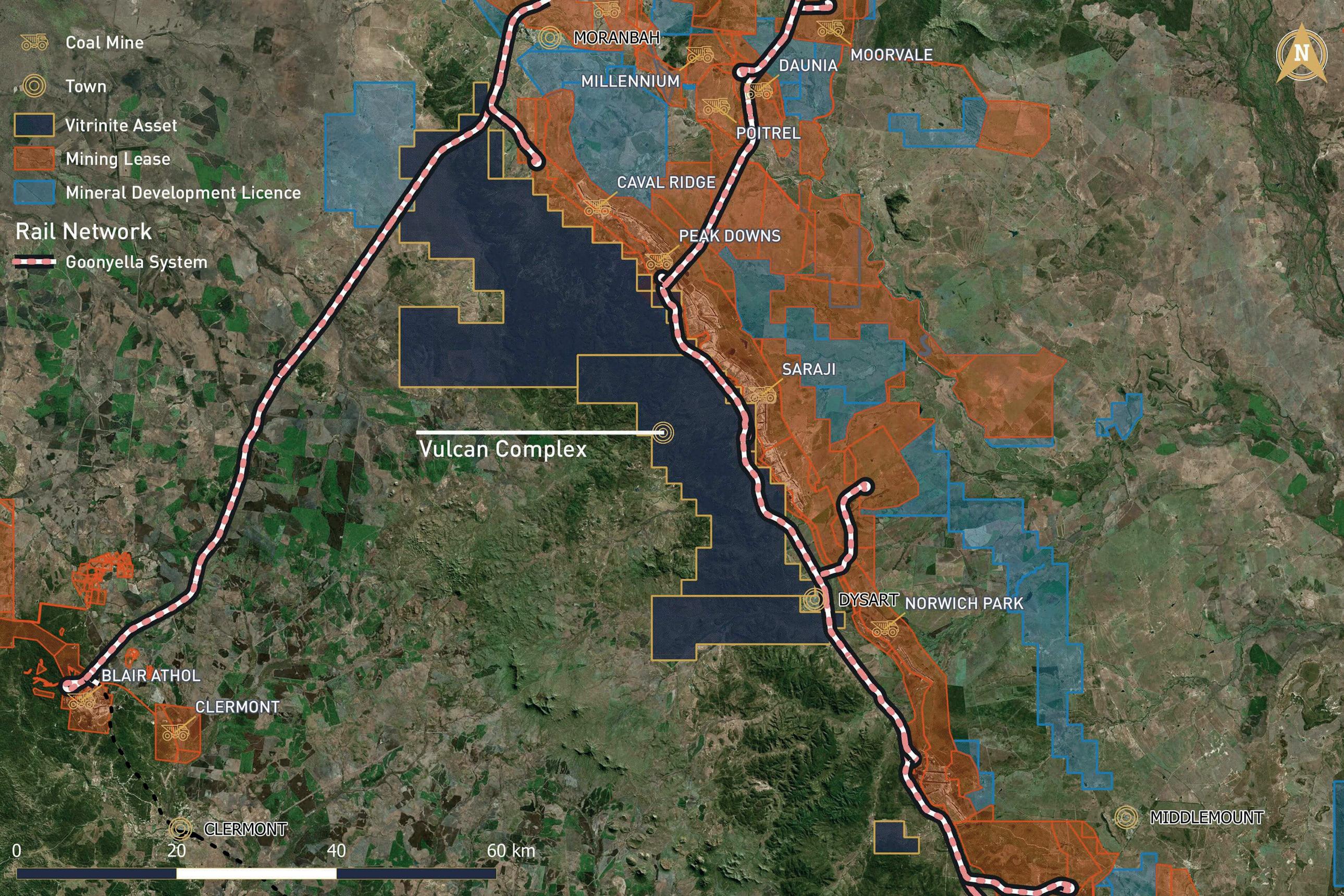 coal seams throughout the centre of the tenement. The area is characterised by reasonably benign regional structures with minor local deformation, with the three target seams featuring premium hard coking coal properties with crucible swelling numbers (CSN) of 7.5 – 9, low volume volatile matter 21 – 26%, Romax of 1.30 – 1.45, and high fluidity. The mine is located near rail, water and power infrastructure, as well as general services in the nearby towns of Dysart and Moranbah.