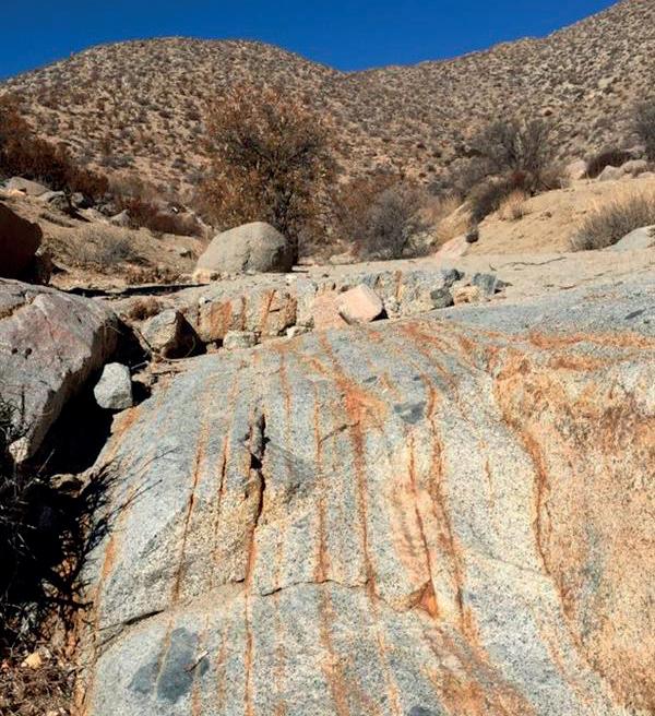 Work to date by GSC has discovered outcropping evidence of intrusive-related Cu-Au style mineralisation, comprising sheeted fracture-vein systems hosted within a granodiorite intrusive. The granodiorite is invaded by clustered monzonitic stocks with associated high-level unidirectional solidification texture (UST) style alteration and Cu-Au mineralisation. The sheeted fracture-vein system is typically oxidised in surface outcrops and appears to define a broad zone of inner calc-potassic alteration that is coincident with medium-high grade copper-gold anomalism in rock chip samples. The relationship between the mineralised fracture-vein system