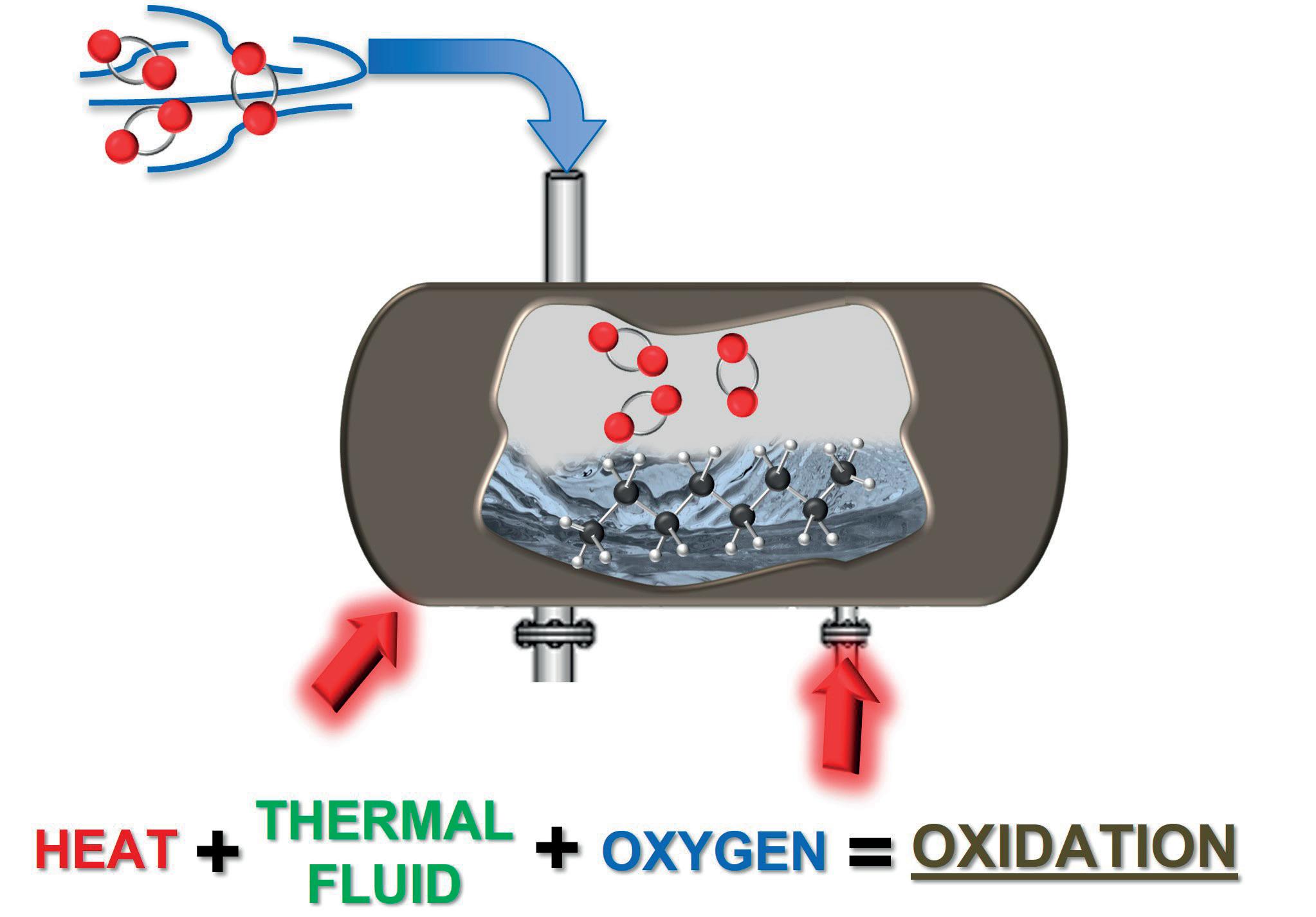 Oxidation is a chemical reaction that occurs when heated thermal fluid is continuously exposed to fresh air. Heat energy initiates the breaking of hydrocarbon chains, making the molecules susceptible to further reaction. When in contact with fresh air at elevated temperatures, the degraded hydrocarbons react with oxygen molecules and other stable hydrocarbons to form a variety of new highly-reactive intermediates and byproducts. In a traditional thermal fluid system, the only area that creates the potential for these factors to come together is inside of the expansion tank (see Figure 6). Continued exposure to heat and air under these conditions will perpetuate chain reactions and result in the formation of acidic material (carboxylic acid).