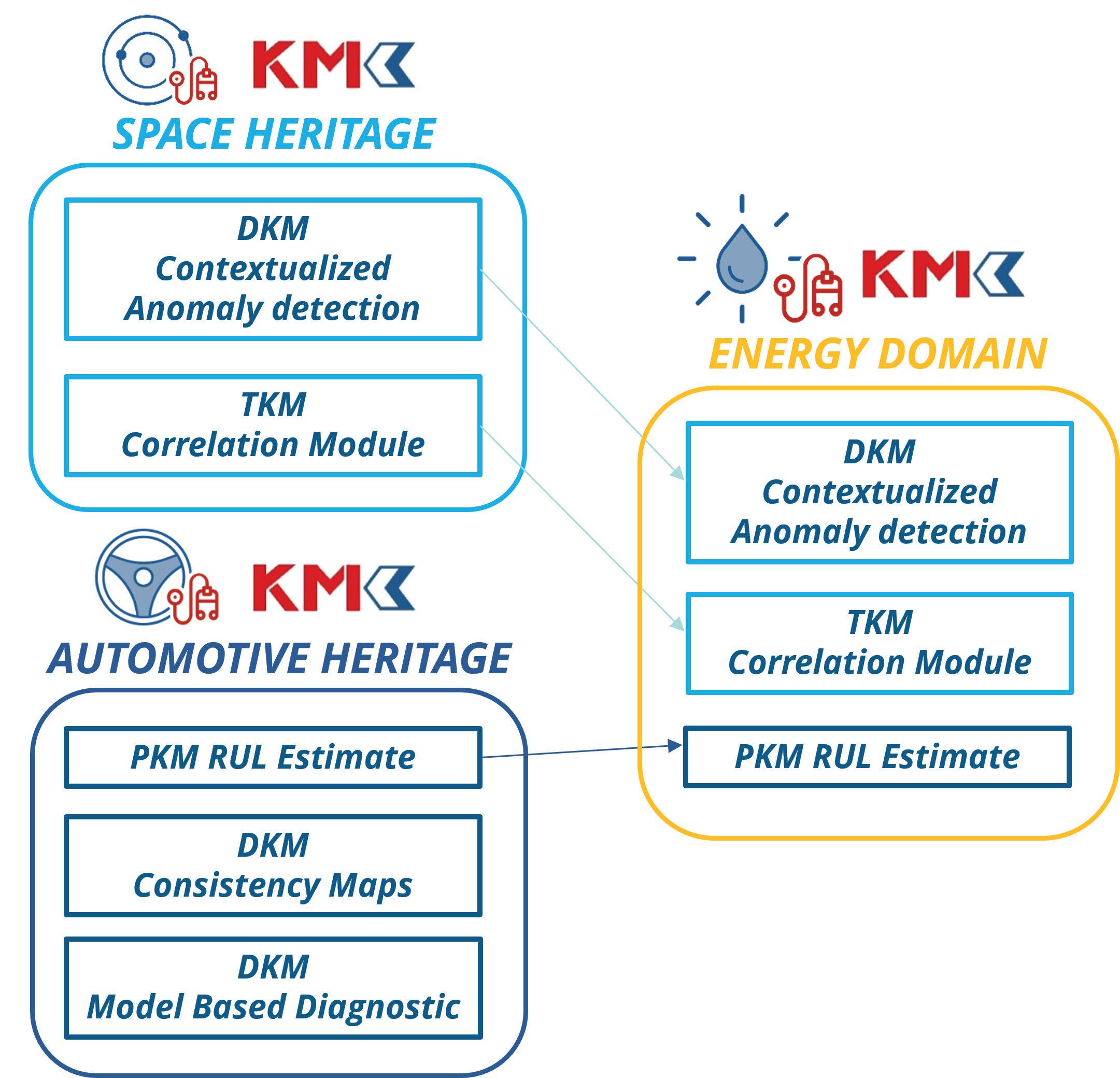 Figure 4 shows an overall view of the technical solution that was proposed. The KMs exploited for the energy domain are highlighted with an orange rectangle, derived partly from the space sector (light blue rectangle) and partly from the automotive sector (blue rectangle).