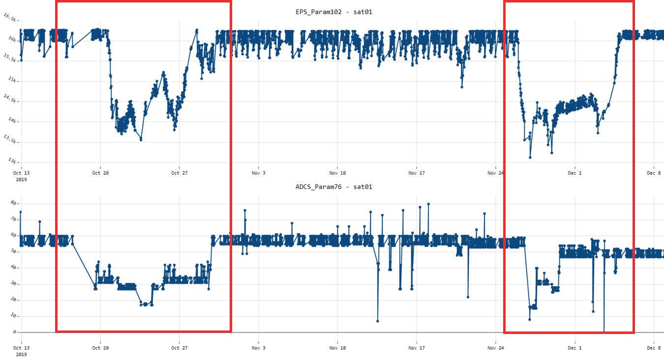 The TKM Correlation Module automatically identifies correlated telemetries and anomalies in order to discover potential cause/effects relationships among parameters or subsystems, during nominal or anomalous behaviour. In fact, considering that the effects of an anomalous event can often be observed in multiple parameters, also belonging to different subsystems, the identification of correlated anomalies is of importance in order to identify the causes of the anomaly events and to support the engineers in the interpretation of the behaviour detected. The advantage of this approach – one that combines early anomaly detection and correlated events detection – is that it also facilitates the extraction of new knowledge. Figure 2 illustrates a set of parameters from a real space mission. These parameters present some anomalies in the periods included in the red rectangles. These anomalies were identified as correlated by the TKM Correlation Module. These results were reported to engineers, who stated that pure engineering knowledge alone would not have led them to expect a correlation to exist among those parameters had it not been for the data, which then enabled an engineering explanation to be formed.