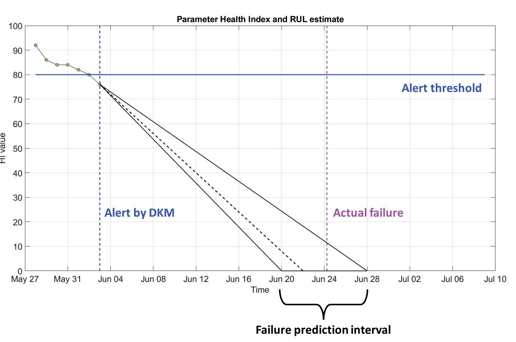 When the HI is decreasing and goes below the alert threshold (HI < 80), the alert is raised. At this point, the PKM RUL estimate is triggered and the RUL estimate (black dashed line) is computed.