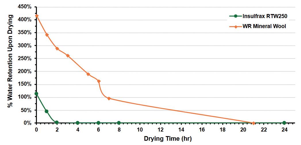 Figure 3. Steam is incredibly permeable throughout the Insulfrax RTW250 Blanket when saturated with water, providing a quick drying solution. Traditional water resistant mineral wool loses water repellent properties after submersion in water and is much slower to dry; requiring at least 8 hours at 45°C.