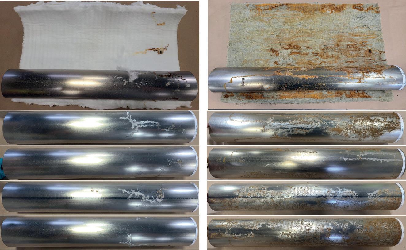 Under simulated conditions, Insulfrax RTW250 Blanket effectively protects against CUI under highly corrosive conditions. A stainless steel pipe was wrapped in the insulation and exposed to a 5% NaCl solution at 35°C for 21 days (Figure 4). Visual inspection of the pipe sample after the 21-day exposure shows the pipe is protected from corrosion under highly corrosive conditions. Areas of the pipe that were exposed to the conditions demonstrated considerable rust and corrosion. Slight corrosion was observed at the edges of the blanket, which highlights a crucial need for the blanket to be tight to the equipment that is being protected.
