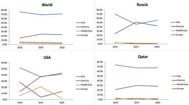 A comparison of the main markets for the largest LNG producing companies (Qatar, Australia, US, and Russia) demonstrates the different strategies: Asia is the only one used for Australian projects (more than 99.5% from produced LNG). Qatar followed world market trends and the change in sales in the world has mirrored the sales of Qatar’s LNG facility. The US and Russia are finding a balance between different regions in Asia/Europe, and the Middle East/North America.