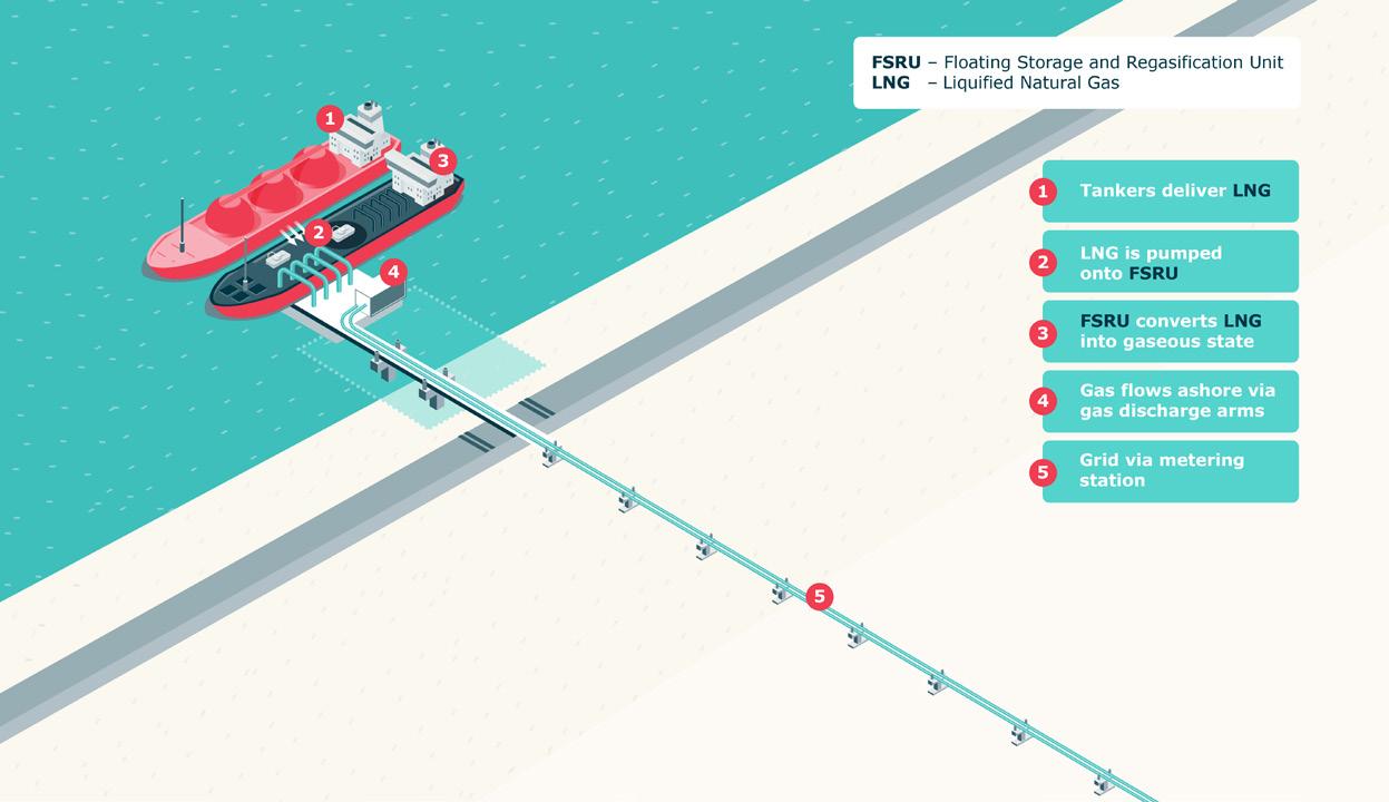 To meet this challenge as the Russia–Ukraine conflict started, the German government acted quickly to charter five FSRUs. These were to be positioned across Germany’s northern coastline to receive LNG from cargo ships, which would then be fed into local gas grids.