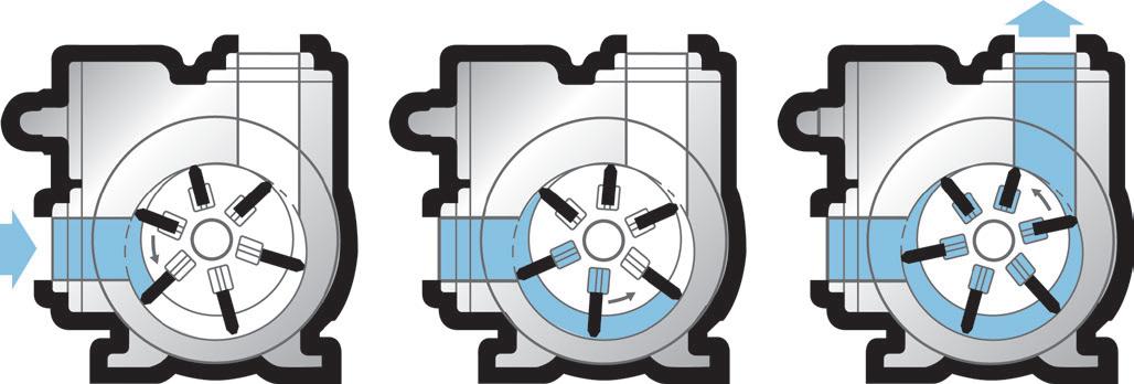 where it is discharged as the pumping chamber is squeezed down. Each vane provides a positive mechanical push to the liquid before it.