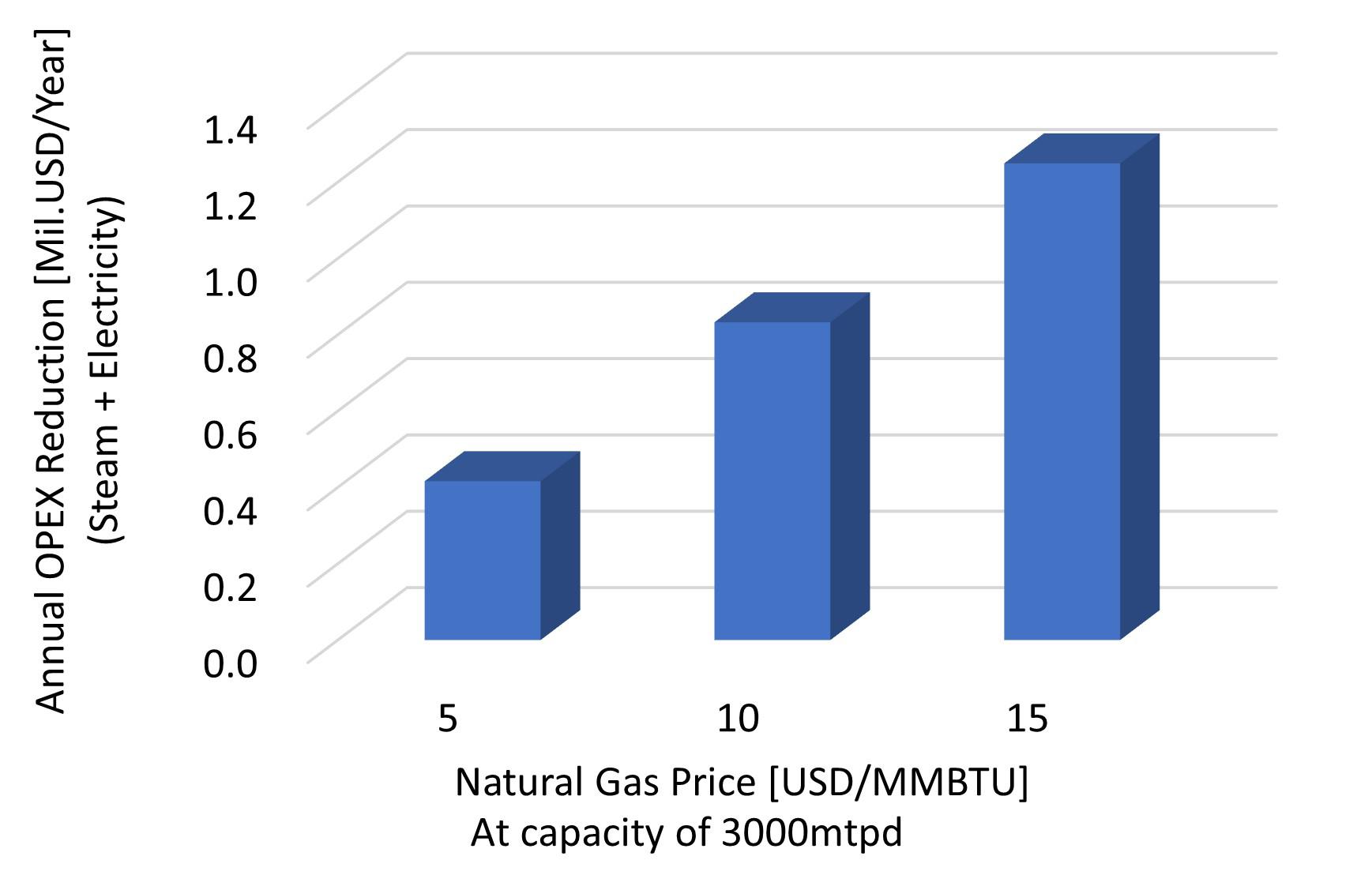 Figure 6 shows the OPEX savings by power reduction of high-pressure pumps (for NH 3 and carbamate) after converting an existing ACES21 plant to ACES21-LP without production increase. Savings in OPEX can be seen to account for US$0.2 – 0.7 million annually depending on natural gas price. Thus, the expense for upgrading a urea plant could be recovered within a few years, even in the case of cheap natural gas at US$5/MMBtu, and needless to say, higher natural gas prices would shorten this payout time.