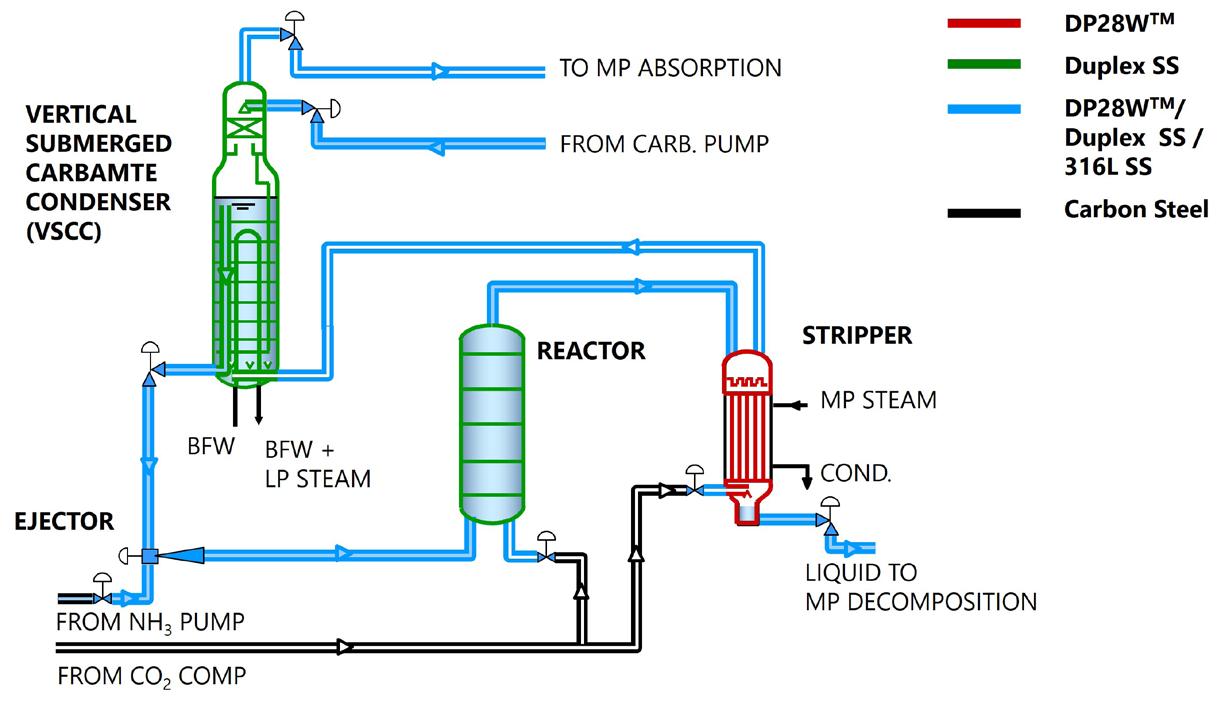 The updated technology, ACES21-LP®, 1,2 lowers synthesis pressure to 136 barG from 152 barG, through the application of DP28W TM duplex stainless steel and 316L stainless steel in the urea