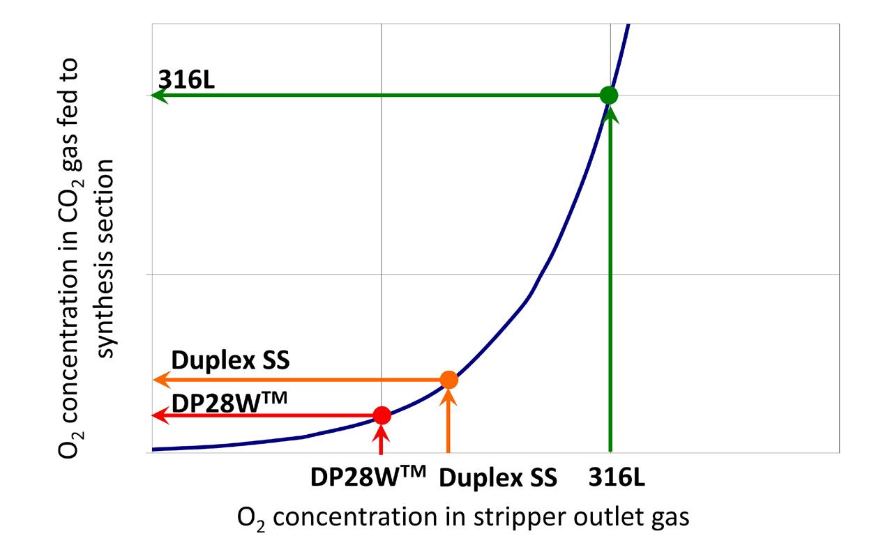 Oxygen concentration becomes the lowest at the stripper and stripper outlet gas stream. Since DP28W is normally applied to the stripper as proprietary equipment, the passivation requirement of the stripper outlet piping determines the required oxygen content in the CO 2 fed to synthesis section. Figure 2 shows the minimum required oxygen concentration for passivation in the gas phase to prevent active corrosion of the duplex stainless steel and 316L UG identified by TOYO’s intensive R&D and electrochemical studies. Figure 3 shows a correlation between the oxygen concentration in the stripper outlet gas, and oxygen concentration in CO 2 fed to the synthesis section, with the required oxygen concentration to passivate each material. This indicates that passivation air can be reduced by applying duplex stainless steel or DP28W to the stripper top outlet piping in comparison with 316L piping.
